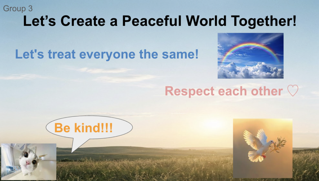 However, when discussing peace in a global context, it required more critical thinking. We needed to understand different perspectives and real-world problems, so it was not completely simple.地球規模の文脈で平和について議論する際には、より批判的な思考が求められました。異なる視点や現実世界の問題を理解する必要があったため、決して簡単なことではありませんでした。