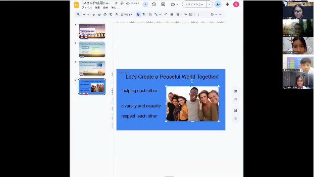 テーマは「みんなで平和な世界を考えよう。What does “a peaceful world” mean to you?」