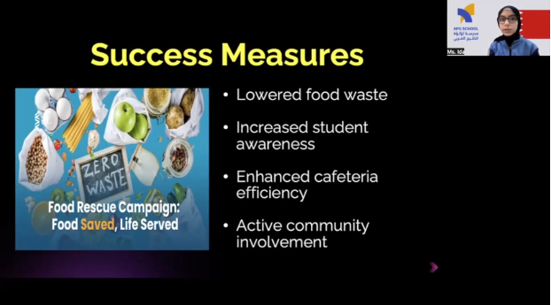 バーレーンで深刻な食品ロスの問題が、なぜ起こりどのような影響があるか説明したうえで、食品ロスに対する解決策として、食品ロス啓発キャンペーンや、食品ロスに関する教育をカリキュラムに組み込むことなどを包括的に提案しました。さらに、解決策が成功だったかを測定する方法まで検討し、発表していました。
