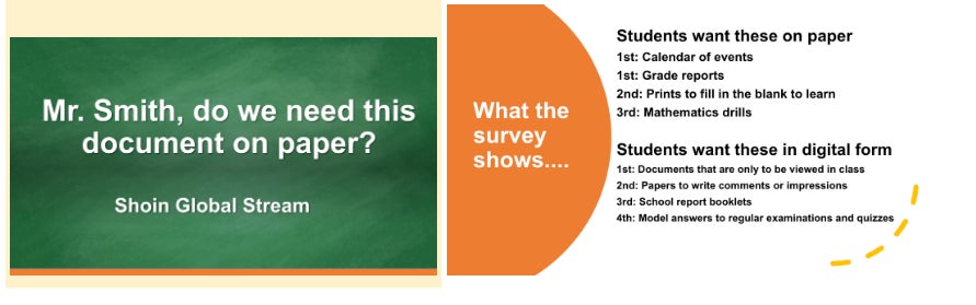 紙の過剰使用について、生徒の目線から先生に向けて問題提起・調査したプレゼンテーション。校内での調査を踏まえて、紙媒体で提供してほしい資料とデジタルで提供してほしい資料を提案。
