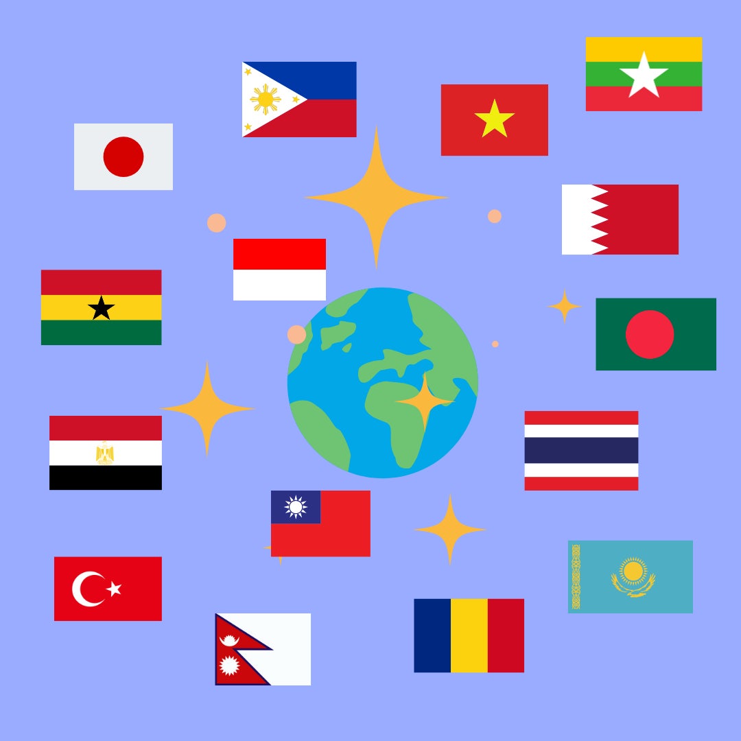 日本、バーレーン、バングラデシュ、エジプト、ガーナ、インドネシア、ミャンマー、フィリピン、台湾、タイ、トルコ、ベトナム、ネパール、カザフスタン、ルーマニア