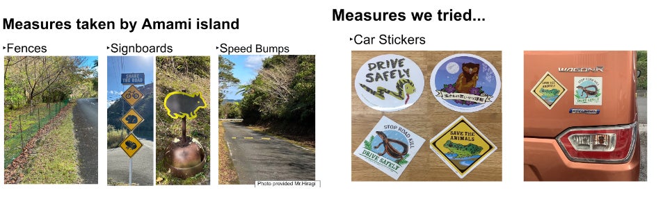 アマミノクロウサギのロードキル(交通事故死)について、アマミノクロウサギを守るために、これまで実施したステッカー作成やラジオでの啓蒙、そして5年以内に行う解決策を提案。